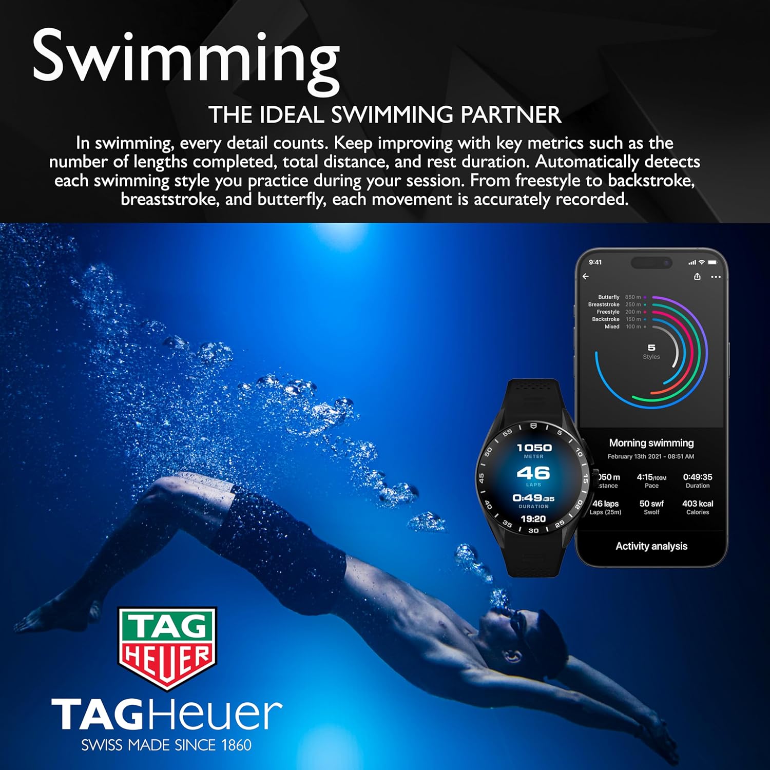 - 奢華與運動和健身 – Tag Heuer 健身手錶功能包括心率、健康、健身、步數、通話、簡訊、電子郵件、指南針、麥克風、氣壓計讀數、翻譯等。 預先安裝的應用程式和功能包括 TAG Heuer Sports (跑步、騎自行車、健身、游泳、其他運動)、TAG Heuer Wellness、TAG Heuer Golf、NFT Viewer。